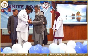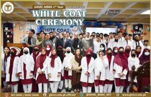 Swabi: Gajju Khan Medical College (GKMC-MTI) Swabi organized a ๐๐ก๐ข๐ญ๐ ๐๐จ๐๐ญ ๐๐ง๐ ๐๐๐ญ๐ก-๐๐๐ค๐ข๐ง๐ ๐๐๐ซ๐๐ฆ๐จ๐ง๐ฒ on Tuesday, March 4, 2025, to welcome its newly enrolled ๐๐ข๐ซ๐ฌ๐ญ-๐ฒ๐๐๐ซ ๐๐๐๐ ๐ฌ๐ญ๐ฎ๐๐๐ง๐ญ๐ฌ into the medical profession.
