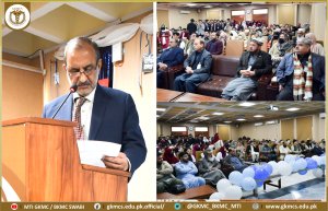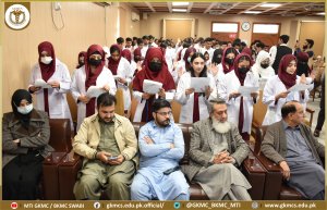 The event was graced by ๐๐๐๐ง/๐๐๐ ๐๐ซ๐จ๐. ๐๐ซ. ๐๐ก๐๐ฆ๐ฌ-๐๐ซ-๐๐๐ก๐ฆ๐๐ง, ๐๐จ๐ฌ๐ฉ๐ข๐ญ๐๐ฅ ๐๐ข๐ซ๐๐๐ญ๐จ๐ซ ๐๐ซ. ๐๐ก๐๐ฅ๐ข๐ ๐๐๐ฌ๐ฎ๐, ๐๐ง๐ ๐๐ฌ๐ฌ๐จ๐๐ข๐๐ญ๐ ๐๐๐๐ง ๐๐ง๐๐๐ซ๐ ๐ซ๐๐๐ฎ๐๐ญ๐ ๐๐ซ๐จ๐. ๐๐ซ. ๐๐ฎ๐ค๐ก๐ญ๐ข๐๐ซ ๐๐ฅ๐ข ๐๐ฌ ๐๐ก๐ข๐๐ ๐ ๐ฎ๐๐ฌ๐ญ๐ฌ, along with faculty members and department heads. Dean/CEO Prof. Dr. Shams-Ur-Rehman welcomed the students, sharing a brief history of GKMC-MTI and congratulating them on choosing this noble profession.